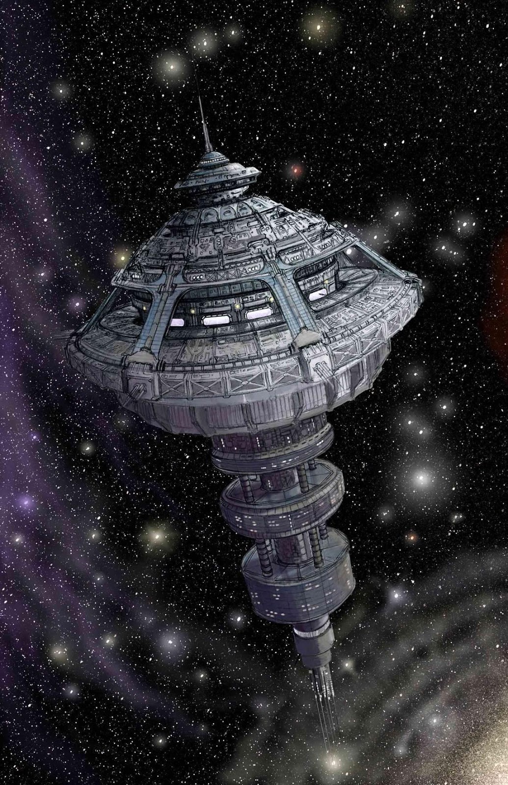 In the premiere the show spends a good portion of the episode on the ship, but there is an adventure that does introduce us to our first non-ship experience. While I can’t tell you anything about that, because it’s to fun to risk spoiling anything, I can tell you that in future episodes we will get to explore life on space stations and how they exist in the world of Dark Matter. The images I can share with you show the conceptualization and evolution of the space station and you can see how this intricate design came to be. This is a prime example of the exemplary work we can expect to see from Lawren and his VFX team.