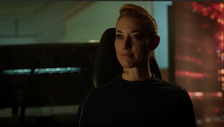 When the extraction device was attached to the Android we got to see a very human-like side of her come out. Through Palmer’s detail oriented performance we got to see some unusual emotions flash through the Android’s eyes. As she realized what was happening, and the device embedded into her head, there was a legitimate response to pain and perhaps even a tiny shred of fear. The pain was a physical reaction that seemed to defy her programming but the fear seemed to be more uncharacteristic for an android. To me, it felt like that reaction of fear was more for what will happen to her crew if she can’t manage to protect that data than concern for herself. She doesn’t want to lose the personality she’s worked so hard to develop, but it’s a sacrifice she is willing to make to protect those she cares about. Palmer didn’t speak a word in this brief scene, but her eyes told a powerful story of loyalty and love. What Palmer did with this scene was awe-inspiring and added a ton of depth to the Android. When the Android saw Five enter the room there was the slightest up twinge in Palmer’s lips that gave the Android the appearance of an attempt at a smile. The nuanced things Palmer did throughout these scenes were powerful and gave so much meaning to what the Android was enduring in conjunction with her human counterparts.